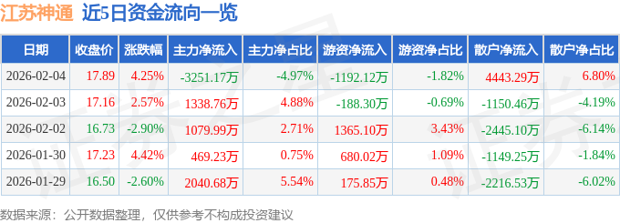 证券之星消息,截至2026年2月4日收盘,江苏神通(002438)报收于17.89元,上涨4.25%,换手率7.75%,成交量36.33万手,成交额6.54亿元。