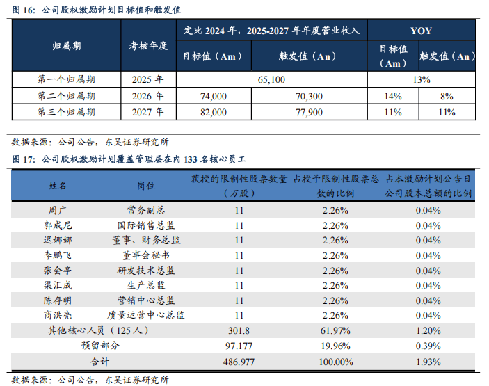 股权激励绑定核心高管,彰显稳健增长信心。2025年8月,公司推出限制性股票激励草案,并于9月完成授予。该计划授予的股票数量为487万股,占公司总股本约1.9%。计划覆盖核心管理层及技术骨干共133人。激励计划的考核年度为2025-2027年,触发值为营收6.5(+13%,同比,下同)/7.0(+8%)/7.8(+11%)亿元,目标值为营收6.5(+13%)/7.4(+14%)/8.2(+11%)亿元。股权激励计划绑定公司与核心员工利益,且彰显成长信心。