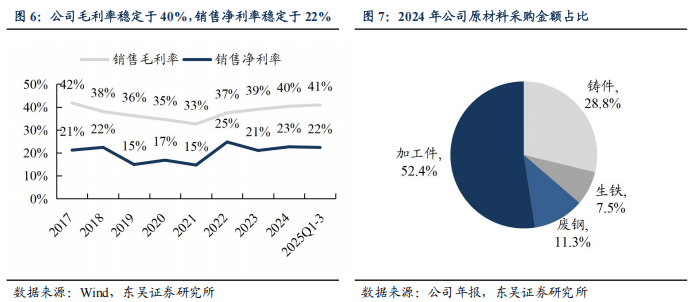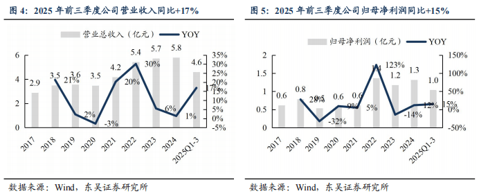 公司上市以来业绩增速稳健。2017-2024年营业总收入由2.9亿元增长至5.8亿元,CAGR为 10.6%;归母净利润由 0.6亿元增长至 1.3亿元,CAGR 为 11.5%。2023-2024年收入增速放缓,我们判断系原材料价格下降,而公司采用成本加成定价法,产品单价下降导致表观收入增速放缓,且美国关税冲击下,市场拓展节奏阶段性受到干扰。