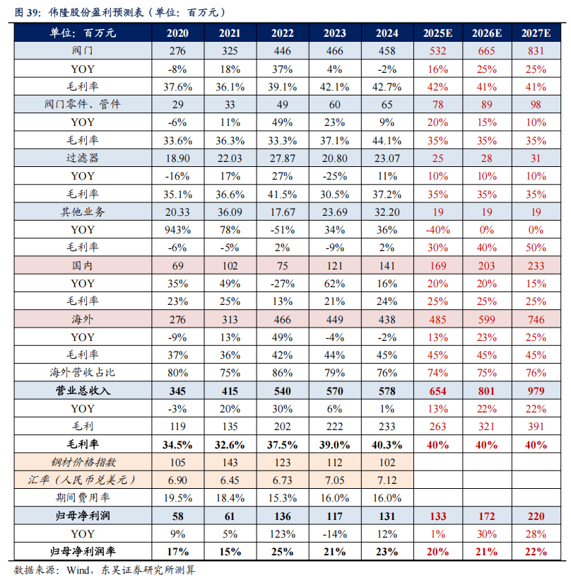 (2)阀门零件、管件:营收增速假设主要考虑其作为阀门配套业务的稳定属性及国内维保需求释放。毛利率假设基于其相对稳定的盈利特征并趋于历史中枢水平。我们预计该业务2025-2027年收入0.8/0.9/1.0亿元,同比+20%/+15%/+10%,预计毛利率为35%/35%/35%。
