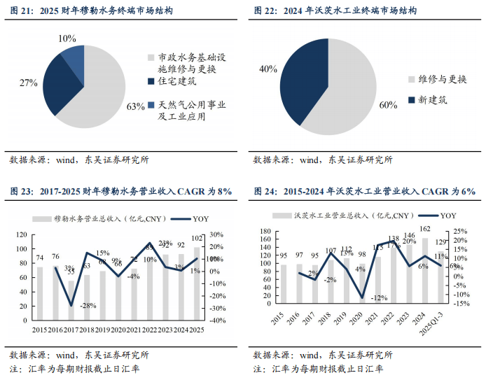 从海外龙头业绩表现看,水处理行业周期性弱。穆勒水务、沃茨水工业等海外水处理阀门龙头过去十年营业收入保持稳健增长,且其营收结构中,约60%的需求来自于存量维修维保。
