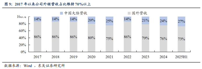 海外毛利率领先于国内20pct,2022年以来内外销毛利率稳步提升。2025年上半年公司海外毛利率 44.8%,同比下降1.8 pct,主要系阶段性因素如汇率、原材料价格影响。2025年上半年公司国内毛利率 25.0%,同比提升3.9pct,我们认为系高端产品占比提升以及规模效应释放。