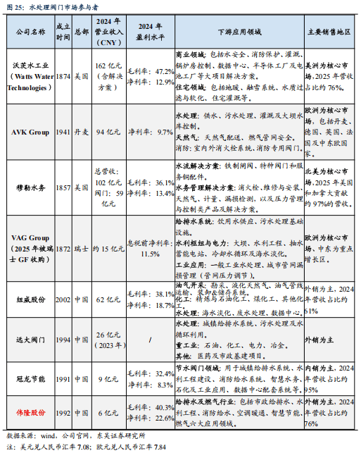 海外领先的水处理阀门厂商包括沃茨水工业(2024年营收162亿元人民币)、AVK(2024年营收94亿元人民币)及穆勒水务(2024年阀门类营收59亿元人民币)等,盈利表现均优秀,营收增速稳健。国产水阀厂商营收体量仍较小,且自有品牌出海份额、后市场服务占比低,中长期成长空间广阔。2024年伟隆股份营收约6亿元,全球市场份额不足1%,成长可期。