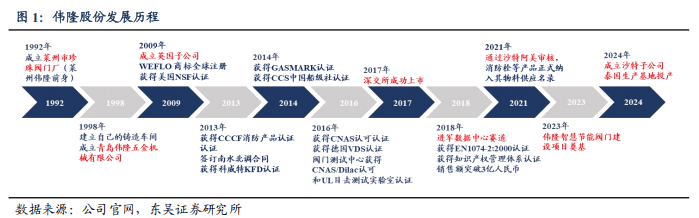 伟隆股份深耕水阀行业三十余年,海外资质认证完备、渠道建设较成熟,先发优势明显。经过多年沉淀,公司产品已取得中国船级社型式认可证书、欧盟CE认证、英国WRAS饮用水认证、美国UL饮用水/FM/NSF认证、阿联酋Civil Defense民防认证等,产品销往全球70多个国家和地区。于渠道、产能均实现全球化布局,于美国、英国、中国香港、沙特、泰国均设立控股子公司,于沙特、泰国已有产能投建。2021年底,公司成功被沙特阿美公司认定为消防阀门领域合格供应商,成为亚洲唯一此类阀门供应商。